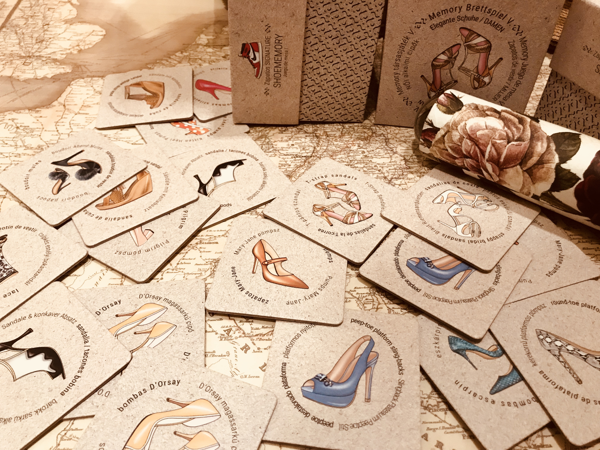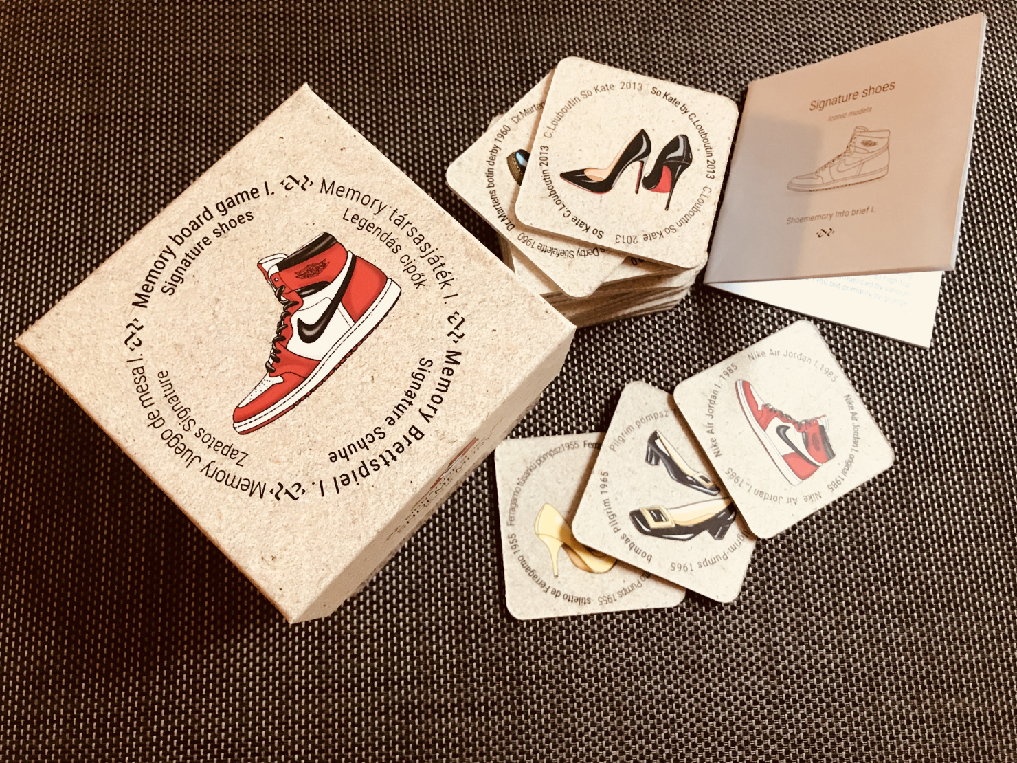 Shoememory is designed to make the traditional memory game a refreshed experience. The concept focuses on shoe design, it’s history & ethnography. It is based on the memory game system, allowing 1 to 4 people to interact directly. The game contains 2×18 cardboard cards that show the iconic image and name of the shoe type in four languages. There’s lots